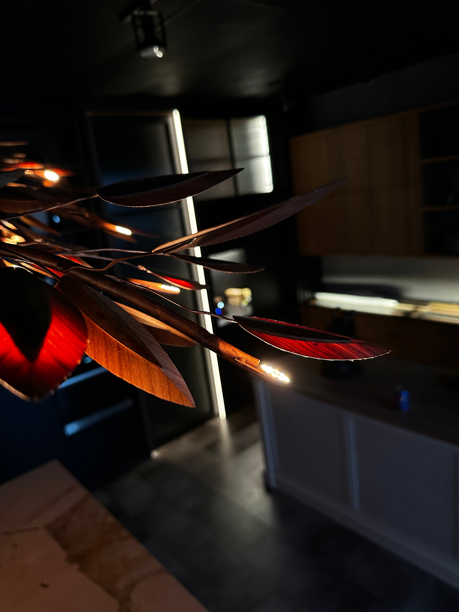 Luminaire fait de cuivre et de placage de Cerisier d’Amérique, fait entièrement a la main. Incluant un système d’éclairage au LED fait au Québec entièrement contrôlable.